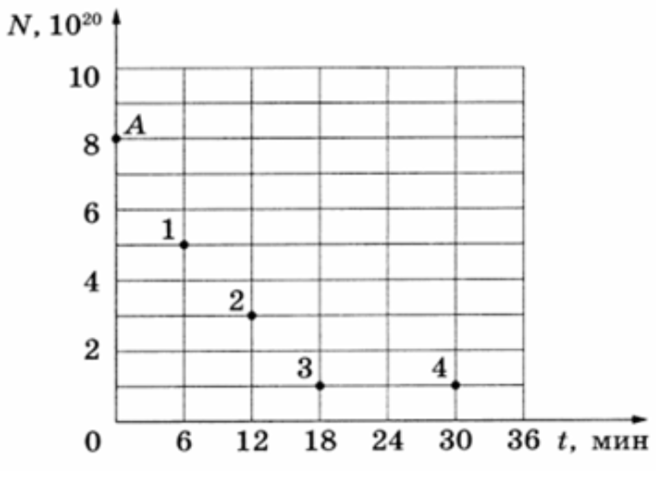 Ядра хрома испытывают β-распад с периодом полураспада 6 мин. В момент начала наблюдения в образце содержится 8⋅1020 ядер этого изотопа хрома. Через какую из точек (1, 2, 3 или 4), кроме точки А, пройдёт график зависимости от времени числа еще не распавшихся ядер хрома?