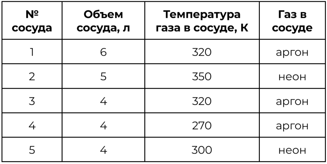 Ученику необходимо на опыте обнаружить зависимость давления газа, находящегося в сосуде, от температуры газа. У него имеются пять различных сосудов с манометрами. Сосуды наполнены различными газами при различной температуре (см. таблицу). Массы газов одинаковы. Какие два сосуда необходимо взять ученику, чтобы провести данное исследование?