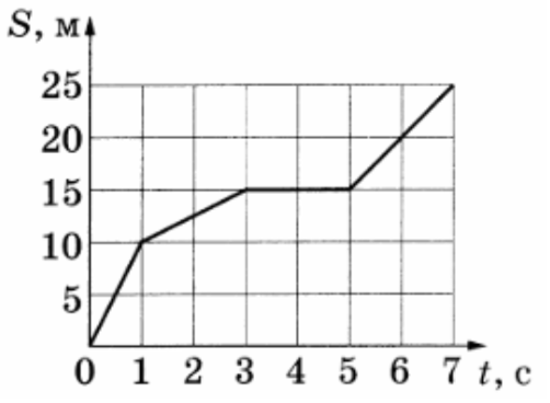 На рисунке представлен график зависимости пути S пройденного материальной точкой, от времени t. Определите скорость тела в интервале времени от 1 до 3 с. Ответ дайте в м/с.