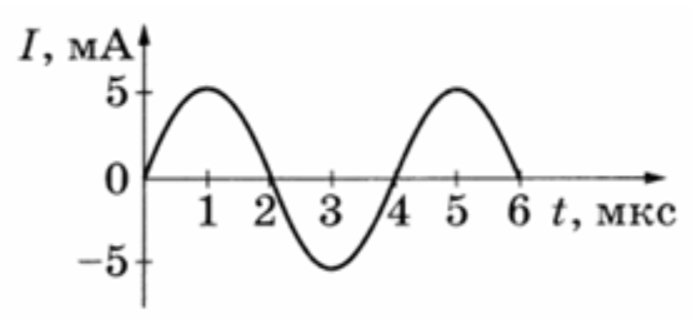 На рисунке приведён график зависимости силы тока I в идеальном колебательном контуре от времени t в процессе свободных электромагнитных колебаний. Каким станет период свободных электромагнитных колебаний в контуре, если катушку в этом контуре заменить на другую, индуктивность которой в 4 раза больше? Ответ дайте в мкс.