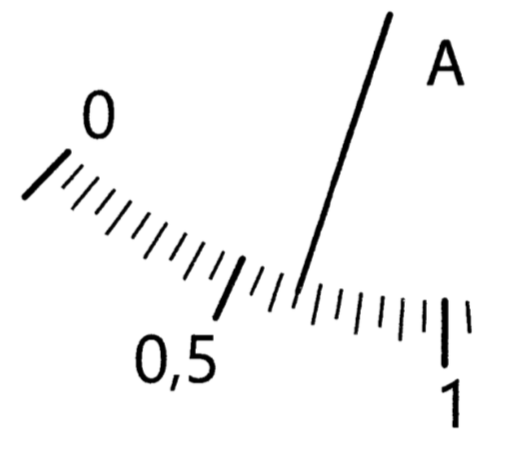 Определите показания амперметра (см. рисунок) с учётом абсолютной погрешности измерений, если абсолютная погрешность прямого измерения силы тока равна цене деления амперметра.