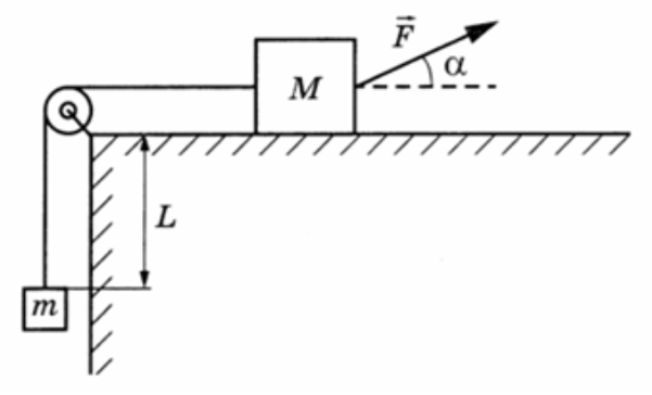 На горизонтальном столе находится брусок массой М = 1 кг, соединённый невесомой нерастяжимой нитью, перекинутой через гладкий невесомый блок, с грузом массой m = 500 г. На брусок действует сила F, направленная под углом α = 30° к горизонту (см. рисунок), F = 9 Н. В момент начала движения груз находился на расстоянии L = 32 см от края стола. За какое время груз поднимется до края стола, если коэффициент трения между бруском и столом μ = 0,3? Сделайте схематичный рисунок с указанием сил, действующих на брусок и груз. Обоснуйте применимость законов, используемых для решения задачи.
