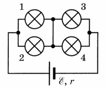 Какая тепловая мощность выделяется на лампе 2 в схеме, изображённой на рисунке? Все лампы, включенные в схему, имеют одинаковое сопротивление R = 20 Ом. Внутреннее сопротивление источника r = 2 Ом; его ЭДС ε = 110 В.