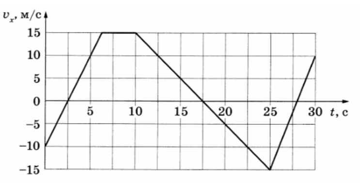 На рисунке приведён график зависимости проекции vx скорости тела от времени t. Определите проекцию ax ускорения этого тела в момент времени 15 с. Ответ дайте в м/с2.