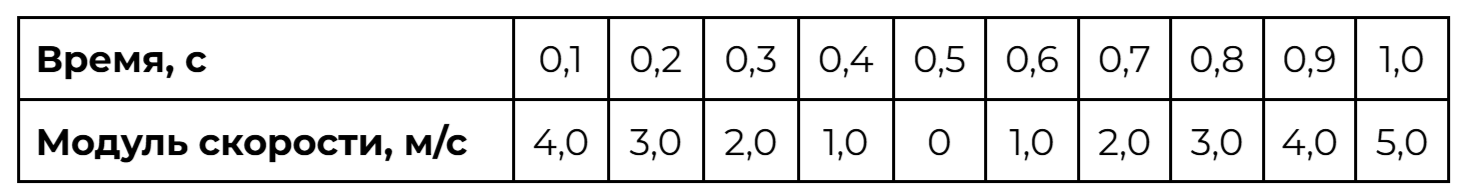 Тело брошено вертикально вверх с поверхности Земли в момент времени t =0. В таблице приведены результаты измерения модуля скорости тела в зависимости от времени. Выберите все верные утверждения на основании данных, приведенных в таблице.