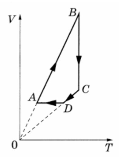 На рисунке показан график циклического процесса, проведённого с одноатомным идеальным газом, в координатах V-Т, где V - объем газа, Т - абсолютная температура газа. Количество вещества газа постоянно.