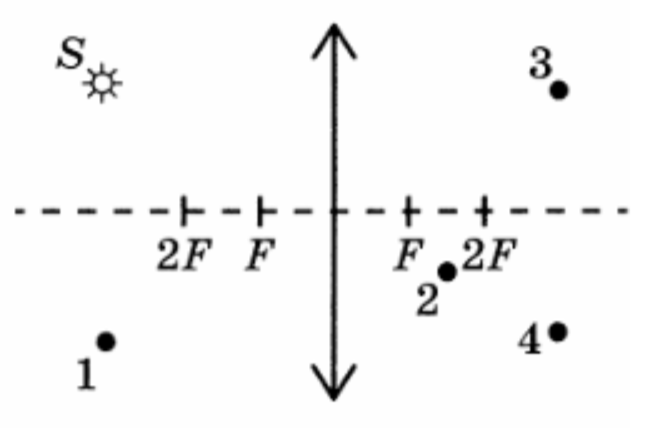 Какая из точек (1, 2, 3 или 4) является изображением точки S, полученным в тонкой собирающей линзе с фокусным расстоянием F (см. рисунок)?