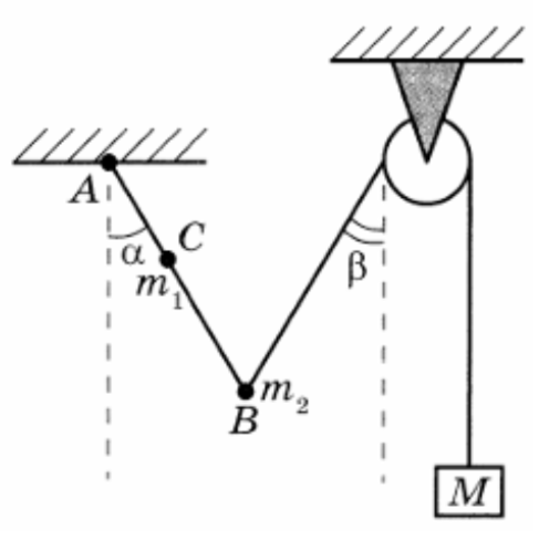 Невесомый стержень AB с двумя малыми грузиками массами m1 = 200 г и m2 = 100 г, расположенными в точках С и В соответственно, шарнирно закреплён в точке А. Груз массой М = 100 г подвешен к идеальному блоку за невесомую и нерастяжимую нить, другой конец которой соединен с нижним концом стержня, как показано на рисунке. Вся система находится в равновесии: стержень отклонен от вертикали на угол α = 30°, а нить составляет угол с вертикалью, равный β = 30°. Расстояние АС = b = 25 см. Определите длину l стержня AB. Сделайте рисунок с указанием сил, действующих на груз М и стержень.