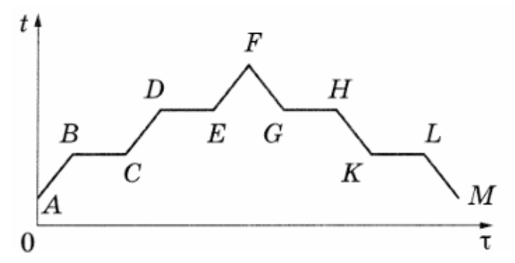 В цилиндре под поршнем находится твёрдое вещество. Цилиндр поместили в горячую печь, а затем выставили на холод. На рисунке схематично показан график изменения температуры t вещества с течением времени . Установите соответствие между участками графика и процессами, отображаемыми этими участками.