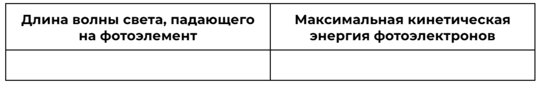 При исследовании зависимости кинетической энергии фотоэлектронов от частоты падающего света фотоэлемент освещался через различные светофильтры. В первой серии опытов использовался светофильтр, пропускающий только желтый свет, а во второй - пропускающий только синий свет. В каждом опыте наблюдали явление фотоэффекта. Как изменились длина волны света, падающего на фотоэлемент, и максимальная кинетическая энергия фотоэлектронов при переходе от первой серии опытов ко второй?