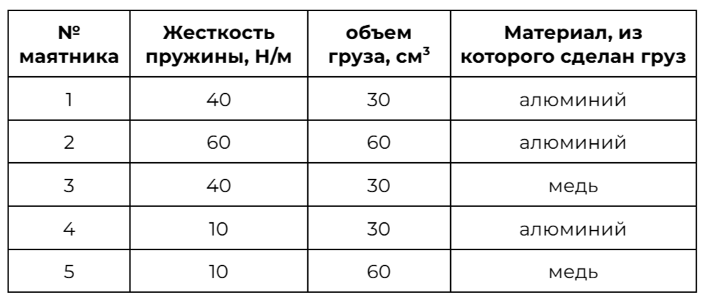 Ученику необходимо на опыте обнаружить зависимость периода свободных колебаний пружинного маятника от жесткости пружины. У него имеется пять пружинных маятников, характеристики которых приведены в таблице. Какие два маятника необходимо взять ученику, чтобы провести данное исследование? Грузы сплошные.