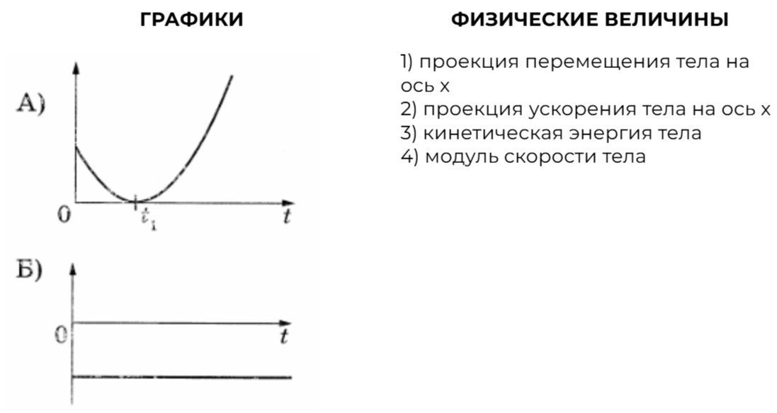 На рисунке показан график зависимости координаты х тела, движущегося вдоль оси Oх, от времени t (парабола). Графики А и Б представляют собой зависимости физических величин, характеризующих движение этого тела, от времени t. Установите соответствие между графиками и физическими величинами, зависимости которых от времени эти графики могут представлять.