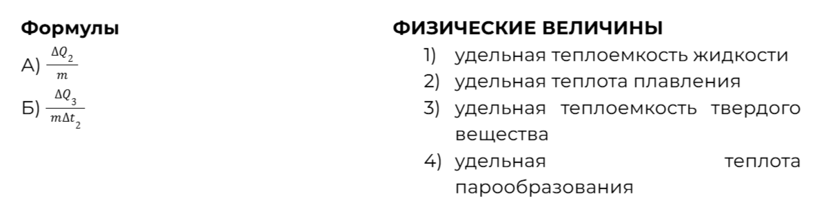 В цилиндре под поршнем находится твердое вещество массой m. Цилиндр поместили в печь. На рисунке схематично показан график изменения температуры t вещества по мере поглощения им количества теплоты Q. Формулы А и Б позволяют рассчитать значения физических величин, характеризующих происходящие с веществом тепловые процессы.