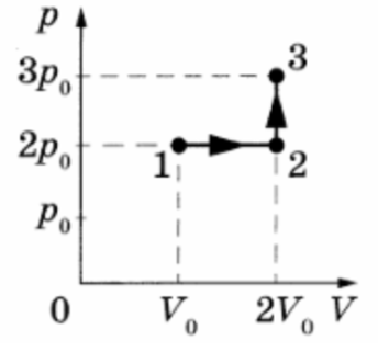 Идеальный газ переводят из состояния 1 в состояние 3 так, как показано на графике зависимости давления газа р от объема V. Macca газа в процессе не изменяется. Из приведённого ниже списка выберите все верные утверждения, характеризующие отраженные на графике процессы.