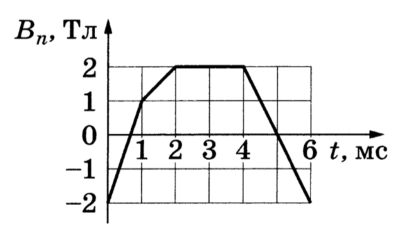 Проволочная рамка площадью 60 см2 помещена в однородное магнитное поле так, что плоскость рамки перпендикулярна вектору индукции В. Проекция Bn индукции магнитного поля на нормаль к плоскости рамки изменяется во времени t согласно графику на рисунке.