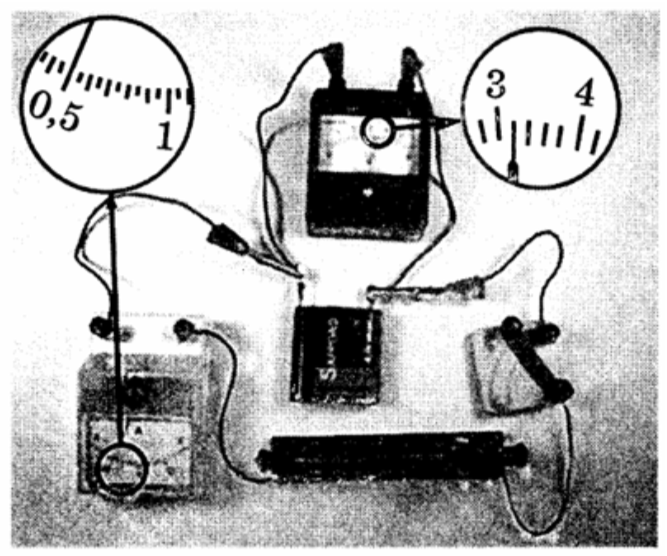 На рисунке приведена фотография электрической цепи по измерению сопротивления реостата. Абсолютные погрешности прямого измерения силы тока в цепи и напряжения на источнике равны половине цены деления амперметра и вольтметра. Какова по результатам этих измерений сила тока, протекающего через источник, с учётом абсолютной погрешности измерений?
