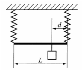 К двум вертикально расположенным пружинам одинаковой длины подвесили однородный стержень длиной L = 40 см. Если к этому стержню подвесить груз массой m = 3 кг на расстоянии d = 5 см от правой пружины, то стержень будет расположен горизонтально, а растяжения обеих пружин будут одинаковы (см. рисунок). Жесткость левой пружины в 3 раза меньше, чем у правой. Чему равна масса М стержня? Сделайте рисунок с указанием сил, использованных в решении задачи. Обоснуйте применимость законов, используемых при решении задачи.