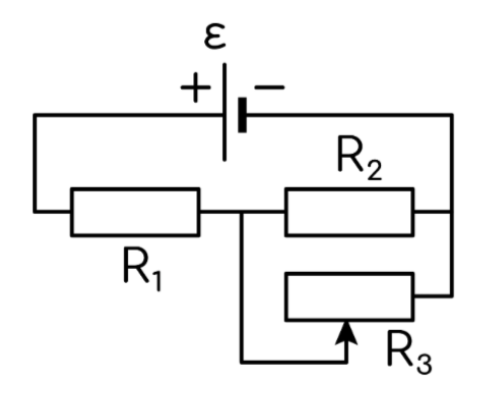 На рисунке показана цепь постоянного тока, содержащая источник тока с ЭДС, два резистора и реостат. Сопротивления резисторов R1 и R2 одинаковы. Сопротивление реостата R3 можно менять. Как изменятся напряжение на резисторе R1 и суммарная тепловая мощность, выделяемая в цепи, если увеличить сопротивление реостата? Внутренним сопротивлением источника пренебречь.