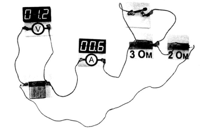 На фотографии изображена электрическая цепь. Начертите принципиальную схему этой электрической цепи. Опираясь на законы постоянного тока, объясните, как должны измениться (уменьшиться, увеличиться или остаться прежними) показания идеальных амперметра и вольтметра при размыкании ключа. Учесть внутреннее сопротивление батарейки, а сопротивлением подводящих проводов и ключа пренебречь.