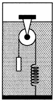 На рисунке показана покоящаяся система тел, состоящая из неподвижного блока с перекинутой через него легкой и нерастяжимой нитью, к концам которой привязаны груз массой m = 0,8 кг и объемом V = 100 см3 и легкая пружина жесткостью k =100 Н/м. Эта система погружена в сосуд с жидкостью плотностью ρ = 900 кг/мЗ. Нижний конец пружины прикреплен к дну сосуда. Как и на сколько изменится сила натяжения нити, действующая на пружину, если всю жидкость вылить из сосуда? Считать, что трение в оси блока отсутствует.