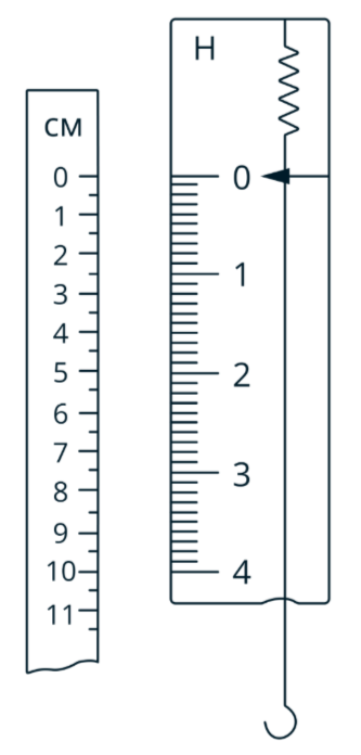На рисунке изображены лабораторный динамометр и линейка. Шкала динамометра проградуирована в ньютонах, шкала линейки проградуирована в сантиметрах. Определите жесткость пружины этого динамометра. Ответ дайте в Н/м.