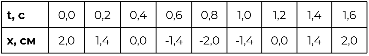 Небольшой груз, покоящийся на гладком горизонтальном столе, соединен пружиной со стенкой. Груз немного смещают от положения равновесия вдоль оси пружины и отпускают из состояния покоя, после чего он начинает совершать гармонические колебания, двигаясь вдоль оси пружины, вдоль которой направлена ось Oх. В таблице приведены значения координаты груза х в различные моменты времени t.