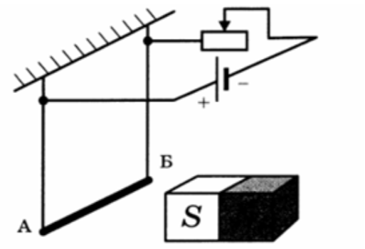 Алюминиевый проводник АБ подвешен на тонких медных проволочках к деревянной балке и подключён к источнику постоянного напряжения так, как показано на рисунке. Вблизи проводника справа от него находится южный полюс постоянного магнита. Ползунок реостата плавно перемещают влево.