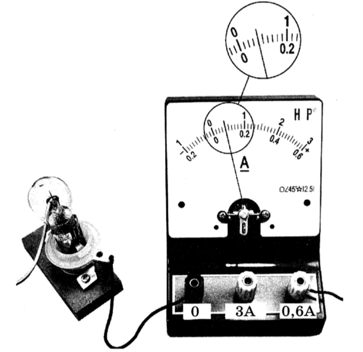 Определите силу тока в лампочке с учётом абсолютной погрешности измерений (см. рисунок), если абсолютная погрешность прямого измерения силы тока равна цене деления амперметра.