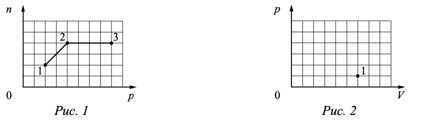 На рисунке а приведена зависимость концентрации n идеального одноатомного газа от его давления р в процессе 1-2-3. Количество вещества газа постоянно. Постройте график этого процесса в координатах p-V (V - объем газа). Точка, соответствующая состоянию 1, уже отмечена на рисунке б. Построение объясните, опираясь на законы молекулярной физики.