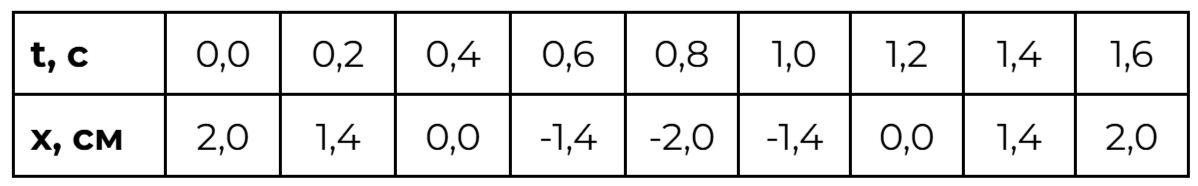 Небольшой груз, покоящийся на гладком горизонтальном столе, соединен пружиной со стенкой. Груз немного смещают от положения равновесия вдоль оси пружины и отпускают из состояния покоя, после чего он начинает совершать гармонические колебания, двигаясь вдоль оси пружины, вдоль которой направлена ось Oх. В таблице приведены значения координаты груза х в различные моменты времени t.