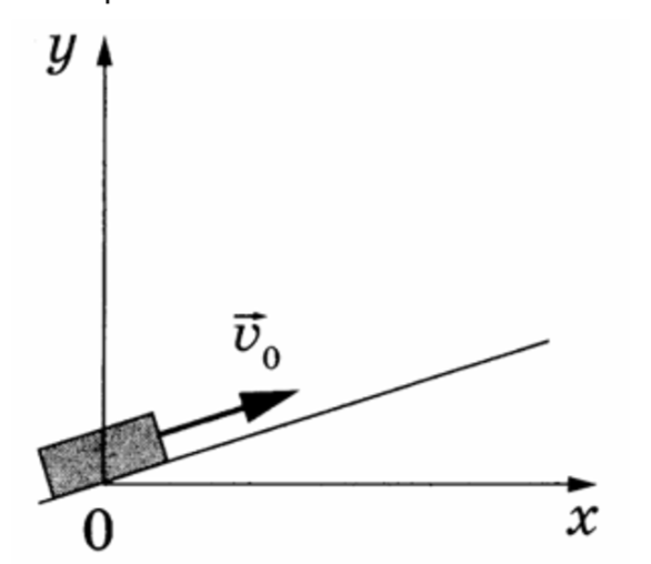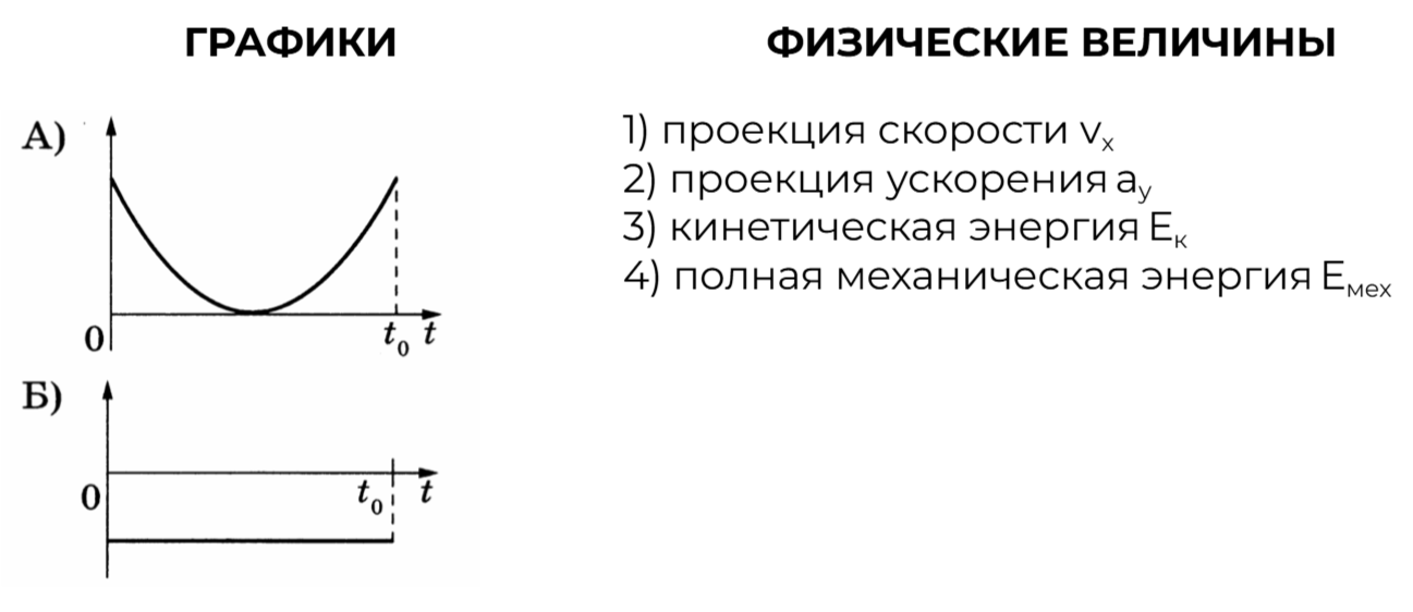 После удара в момент времени t = 0 шайба начала скользить вверх по гладкой наклонной плоскости с начальной скоростью v0, как показано на рисунке. В момент времени t0 шайба вернулась в исходное положение. Графики А и Б отображают изменение с течением времени физических величин, характеризующих движение шайбы. Установите соответствие между графиками и физическими величинами, изменение которых со временем эти графики могут отображать.
