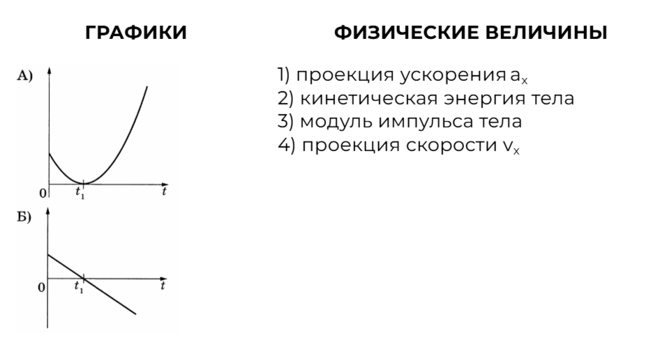 Установите соответствие между графиками и физическими величинами, изменение которых со временем эти графики могут отображать.