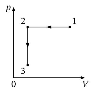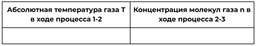 1 моль идеального газа участвует в процессе 1-2-3, график которого изображен на рисунке в координатах p-V, где р - давление газа, V - объем газа. Как изменяются абсолютная температура газа T в ходе процесса 1-2 и концентрация молекул газа n в ходе процесса 2-3?