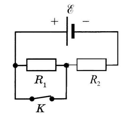 На рисунке показана схема электрической цепи постоянного тока, содержащей источник тока, ЭДС которого равна , и два резистора: R1 и R2. В начальный момент времени ключ К замкнут. Как изменятся сила тока в резисторе R2 и тепловая мощность, выделяющаяся в резисторе R1, если ключ К разомкнуть? Внутренним сопротивлением источника тока и соединительных проводов пренебречь.