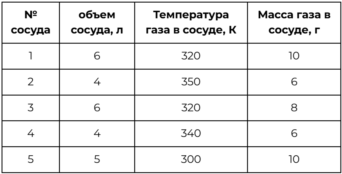 Ученику необходимо на опыте обнаружить зависимость давления газа, находящегося в сосуде, от массы газа. У него имеются пять различных сосудов с манометрами. Сосуды заполнены аргоном разной массы при различных температурах (см. таблицу). Какие два сосуда необходимо взять ученику, чтобы провести исследование?