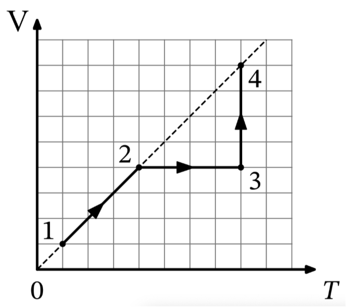 На VT-диaгpaммe показано, как изменялись объем и абсолютная температура некоторого постоянного количества одноатомного разреженного газа при его переходе из начального состояния 1 в состояние 4. Как при этом изменялись давление газа p и его внутренняя энергия U на каждом из трех участков 1-2, 2-3, 3-4 (увеличивались, уменьшались или же оставались постоянными)? Ответ поясните, указав, какие физические явления и законы Вы использовали для объяснения.
