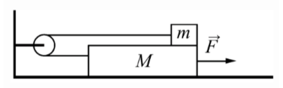 На горизонтальном неподвижном столе лежит доска, на которой находится маленький брусок массой m = 400 г. Брусок и доска связаны невесомой нерастяжимой нитью, перекинутой через невесомый блок, закрепленный на стене (отрезки нити, не лежащие на блоке, горизонтальны и параллельны). Коэффициент трения между бруском и доской μ1 = 0,5, между столом и доской 2 = 0,3. Доску тянут вправо постоянной горизонтальной силой F, параллельной горизонтальным отрезком нити, F = 12 Н. Чему равна масса доски М, если модуль ускорения бруска относительно стола a = 2 м/с2. Трением в оси блока пренебречь. Сделайте рисунок с указанием сил, действующих на доску и брусок. Обоснуйте применимость законов, используемых для решения задачи.