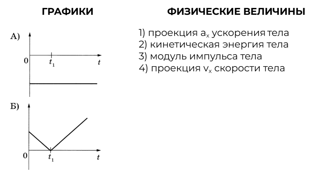 Установите соответствие между графиками и физическими величинами, изменение которых со временем эти графики могут отображать.