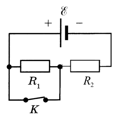 На рисунке показана схема электрической цепи постоянного тока, содержащей источник тока, ЭДС которого равна , и два резистора: R1 и R2. В начальный момент времени ключ К замкнут. Как изменятся напряжение на резисторе R1 и суммарная тепловая мощность, выделяющаяся во внешней цепи, если ключ К разомкнуть? Внутренним сопротивлением источника тока и соединительных проводов пренебречь.