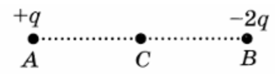 Две маленькие закреплённые бусинки, расположенные в точках А и В, несут на себе заряды +q > 0 и -2q соответственно (см. рисунок).