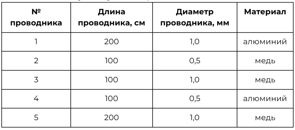 Для лабораторной работы по обнаружению зависимости сопротивления проводника от его длины ученику выдали пять проводников, характеристики которых указаны в таблице. Какие два из предложенных ниже проводников необходимо взять ученику, чтобы провести данное исследование?