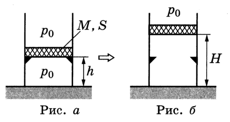 В вертикальном цилиндре с гладкими стенками, открытом сверху, под тяжелым поршнем с площадью основания S находится одноатомный идеальный газ. В первоначальном состоянии поршень покоится на высоте h, опираясь на выступы на внутренней стороне стенок цилиндра (см. рисунок а). Давление газа р0 равно внешнему атмосферному. Газу сообщили количество теплоты Q, и в результате медленного расширения газа нижняя сторона поршня оказалась на высоте Н (см. рисунок б). Чему равна масса поршня М? Тепловыми потерями пренебречь.