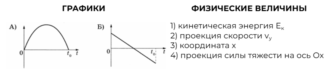 После удара в момент t = 0 шайба начала скользить вверх по гладкой наклонной плоскости с начальной скоростью v0 . как показано на рисунке, и в момент времени t = t0 вернулась в исходное положение. Графики А и Б отображают изменение с течением времени физических величин, характеризующих движение шайбы. Установите соответствие между графиками и физическими величинами, изменение которых со временем эти графики могут отображать.