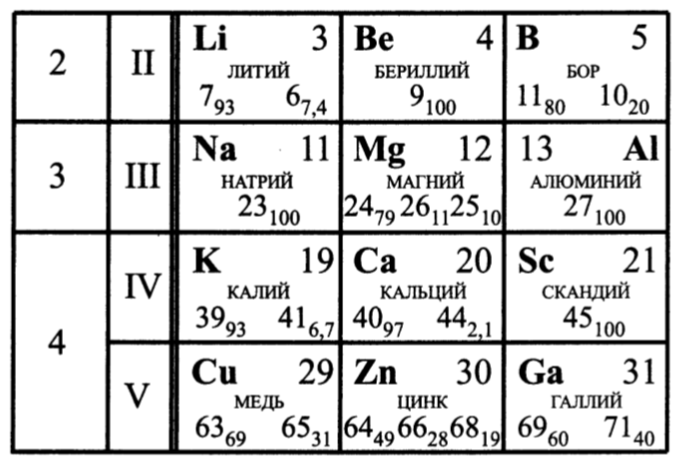 На рисунке представлен фрагмент Периодической системы элементов Д. И. Менделеева. Под названием каждого элемента приведены массовые числа его основных стабильных изотопов. При этом нижний индекс около массового числа указывает (в процентах) распространённость соответствующего изотопа в природе.