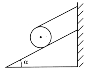 Цилиндр массой m = 1 кг и радиусом R = 4 см, на который намотана нерастяжимая невесомая нить, положили на наклонную плоскость, а конец нити прикрепили к вертикальной стенке. Ось цилиндра горизонтальна. Нить не скользит по цилиндру, параллельна наклонной плоскости и перпендикулярна оси цилиндра (см. рисунок). Коэффициент трения между цилиндром и плоскостью μ = 0,5. При каком максимальном угле наклона плоскости к горизонту цилиндр будет находиться в равновесии? Сделайте схематический рисунок с указанием сил, действующих на цилиндр. Обоснуйте применимость законов, используемых для решения задачи.