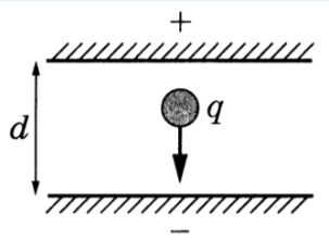 Пластины большого по размерам плоского конденсатора расположены горизонтально на расстоянии d = 2 см друг от друга. Напряжение на пластинах конденсатора 10 кВ. В пространстве между пластинами падает капля жидкости. Заряд капли q = 8⋅10-11 Кл. При каком значении массы капли её скорость будет постоянной? Влиянием воздуха на движение капли пренебречь.