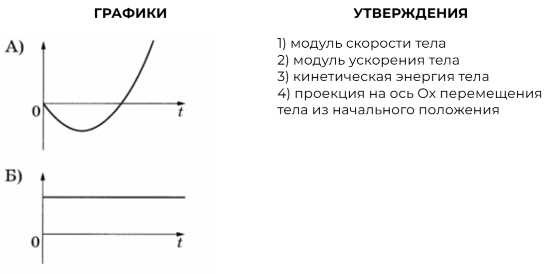 На рисунке показан график зависимости координаты х тела, движущегося вдоль оси Ох, от времени t (парабола). Графики А и Б представляют собой зависимости физических величин, характеризующих движение тела, от времени t.