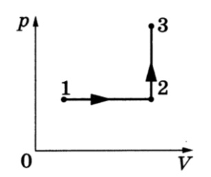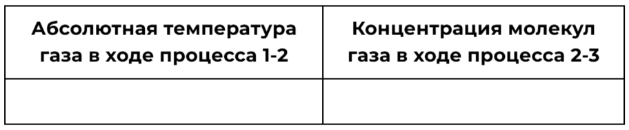 Один моль одноатомного идеального газа участвует в процессе 1-2-3, график которого изображен на рисунке в координатах p-V, где р - давление газа, V - объем газа. Как изменяются абсолютная температура газа Т в ходе процесса 1-2 и концентрация молекул газа n в ходе процесса 2-3?