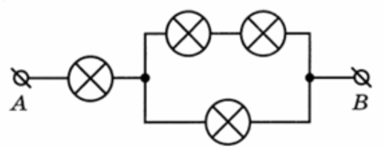 Ученик соединил четыре лампочки накаливания так, как показано на рисунке. Определите сопротивление цепи между точками А и В, если сопротивление каждой лампочки равно 12 Ом. Ответ дайте в Омах.