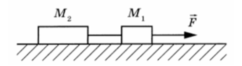 Два груза, связанных нерастяжимой и невесомой нитью, движутся по гладкой горизонтальной поверхности под действием горизонтальной силы F, приложенной к грузу массой М1 (см. рисунок). Максимальная сила F, при которой нить ещё не обрывается, равна 18 Н. Известно, что нить может выдержать нагрузку не более 10 Н. Чему равна масса М1 первого груза, если масса второго равна М2 = 3 кг?
